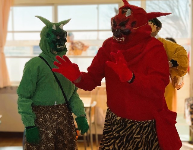 教室の鬼さんが現れると、うれしいやら、怖いやら・・・子どもたちは大騒ぎでした。