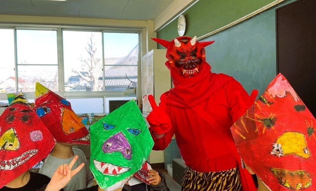 2回目に1年生の教室に行った時には、子供たちが図工で作った鬼の面をかぶって出迎えてくれました。