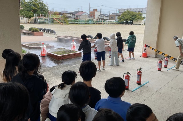 4年生では消火器の使い方、5年生は自分の家の危険な場所の確認や地震情報について、6年生では防災倉庫に入っているものや使い方について教えていただきました。災害に備え自分たちができることを考えていくことができました。