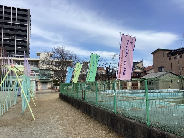 光風中学校区の人権の取り組みとして、4校の児童生徒代表が作った人権標語でのぼり旗を作成しました。