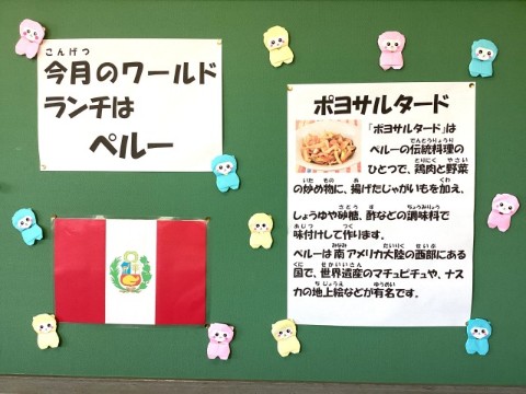 今月のワールドランチは【ペルー】 公開日 2025/12/19 更新日 2025/12/17 給食 今月のワールドランチは、ペルーです。世界遺産のマチュピチュや、ナスカの地上絵などが有名ですね。掲示はアンデス山脈のアルパカをイメージしたつもりです。明日のワールドランチでは、ポヨサルタードを提供します。