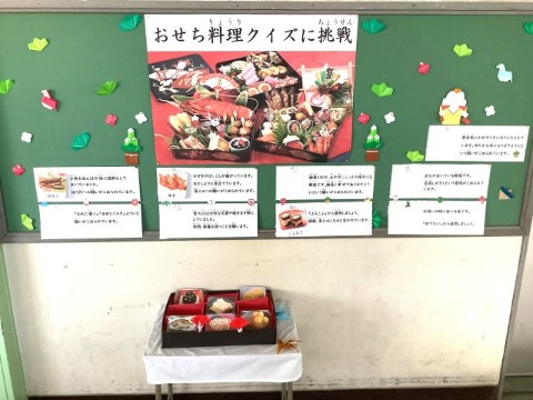 おせちクイズ 公開日 2026/01/08 更新日 2025/12/22 給食 もうすぐ冬休みです。クリスマスにお正月、イベントがたくさん続く予感がします。さて、給食の掲示では、おせちクイズを作ってみました。おせち料理のひとつひとつに込められた思いやいわれをクイズにしました。問題文を読み、答えとなる食材や料理を下の重箱から選んで貼ります。
