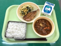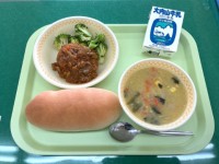 パン牛乳コロッケのカレーミートソースがけゆでブロッコリー中華風コーンスープ中華風...
