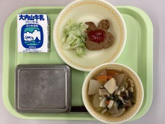 【ごはん 牛乳 うさぎちゃんハンバーグ キャベツソテー いものこ汁】