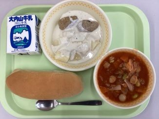 今日のワールドランチは、ドイツ料理です。冬の寒さが厳しいドイツでは、寒い冬に備えて、保存の効くソーセージやハムなどを使った料理がよく食べられています。また、寒い地域でも育ちやすいじゃがいもが広く栽培されています。今日の「ケーニヒスベルガー・クロプセ」は、肉団子とじゃがいもにレモン風味のホワイトソースをかけた料理です。この名前は、ケーニヒスベルグという都市の地名からきています。また、クロプセとは、肉団子の意味です。アイントプフは、「鍋の中に投げ込んだ」や「一つの鍋で調理した」という意味で、ドイツの家庭でよく食べられているスープ料理です。
