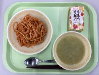 昨年度まで簡易給食は、スパゲッティとフルーツミックスでしたが、今年度より、フルーツミックがコーンスープに変更になりました。