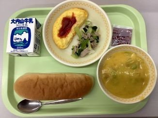 【パン 牛乳 オムレツ 小松菜のソテー かぼちゃのシチュー いちごジャム】