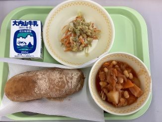 今日 は、ポークビーンズのお話 です。ポークビーンズは、豚肉 と豆 をつかったトマト味 の煮込 み料理 です。アメリカの代表的 な家庭料理 であり、豚肉 の代 わりにベーコンが使 われることも多 いそうです。給食 のポークビーンズは、豚肉 、大豆 のほかに、たまねぎ、にんじん、じゃがいもなどの野菜 を、トマトジュースやケチャップなどの調味料 で煮込 みました。味 わっていただきましょう。