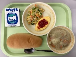 【パン 牛乳 オムレツ ごまドレサラダ クリームシチュー】