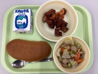 【黒糖パン 牛乳 かつおのノルウェー風 根菜ポトフ】