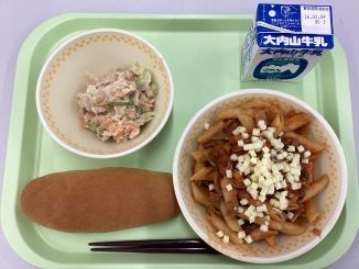 【小型パン 牛乳 ペンネアマトリチャーナ 大豆サラダ】