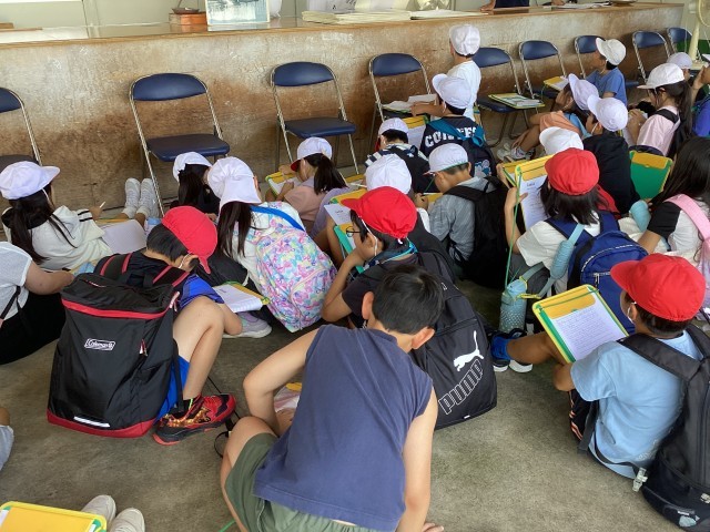 赤須賀漁港では、漁師の方々の仕事の様子や、魚や貝の水揚げの流れ、地域のくらしとのつながりについて学びました。子どもたちは真剣に話を聞き、メモを取りながら学びを深めていました。