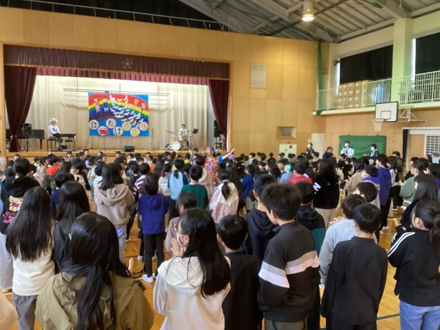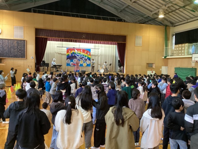 11月5日(水)、今年度の芸術鑑賞会として、音楽グループ「プチジャズバンド・ラブル〜☆」さんをお招きし、「プチジャズコンサート」を体育館で開催しました。サックス・ドラム・エレクトーン・ボーカルによる演奏で、体育館いっぱいに明るく楽しい音が響き渡りました。