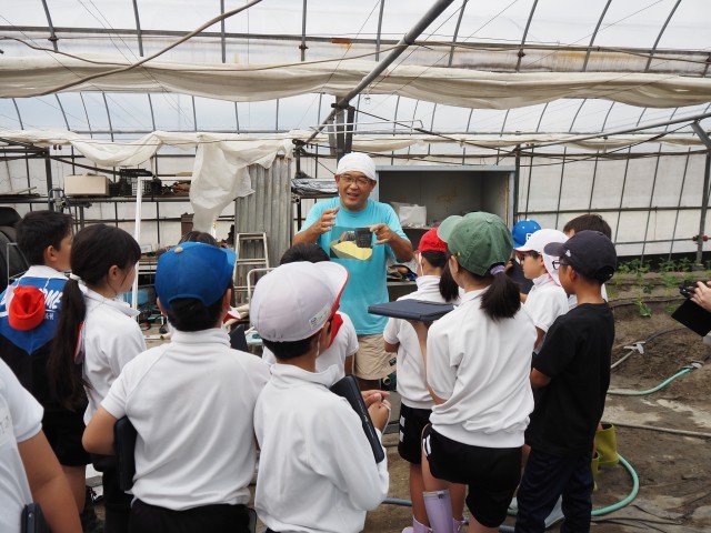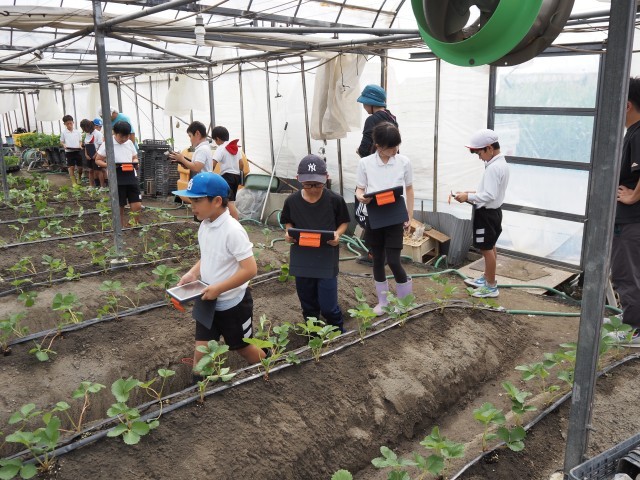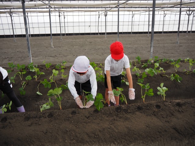 10月7日(火)一学期に引き続き、のらくら農園さんのビニールハウスにおじゃまして「いちご栽培」について学習させて頂きました。今回は「苗の植え付け」を実際に体験させて頂きました。上田さんから丁寧に説明して頂いた後、子ども達は一つひとつの苗を大事に畑の土に埋めていきました。事前に上田さんが苗を植えやすいように穴をあけてくださっていたので、子どもたちはスムーズに苗を中に入れ、最後に押さえつけて固定することができました。中には両手いっぱいにいくつも苗を持つ児童もありみな意欲的に取り組ませていただきました。今後の苗の成長が楽しみですね。のらくら農園さん、ありがとうございました。
