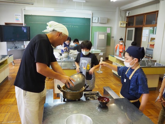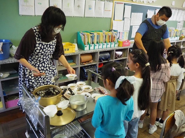10月15日(水)長島北部小学校区にお住まいの水谷洋輔さんに来ていただき、しじみ漁について船を使用して木曽川で行う漁のこととともに「なぜこの仕事に就いたのか」についてもお話しいただきました。漁の時間が「日の出から正午まで」と決められていること、年中できるわけではなく時期も限定されることなど写真を交えて詳しく教えていただきました。その後、水谷さんから「全校児童分」のしじみをいただき、4年生が「しじみ汁」の調理を体験させていただきました。最後に全校児童でおいしくいただきました。長島は河口に近く、豊かなしじみ生息に恵まれています。地元の特産であるしじみをいただきながら地域学習、そして漁師という職業についても学習することができました。水谷さん、ありがとうございました。