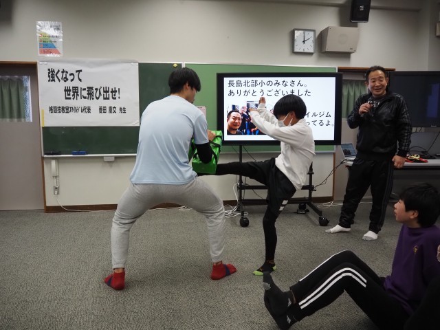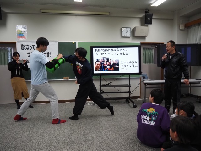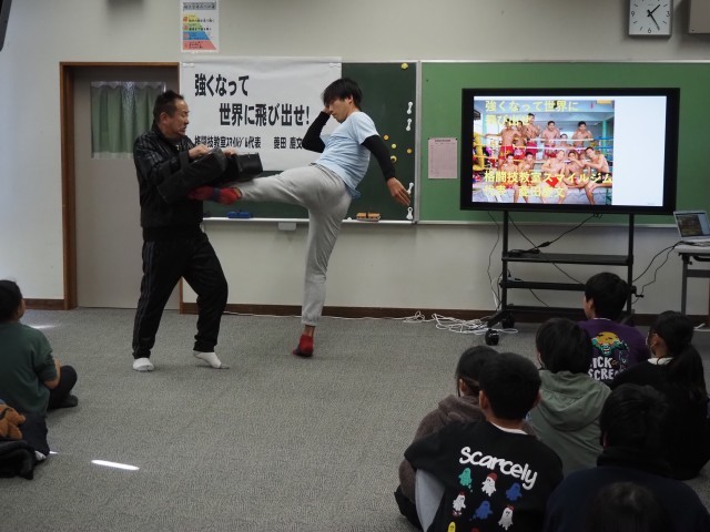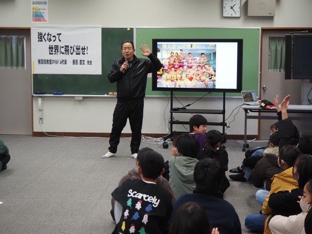 出前授業「強くなって 世界に飛び出せ」格闘技教室スマイルジム代表 菱田慶文先生(5,6年)