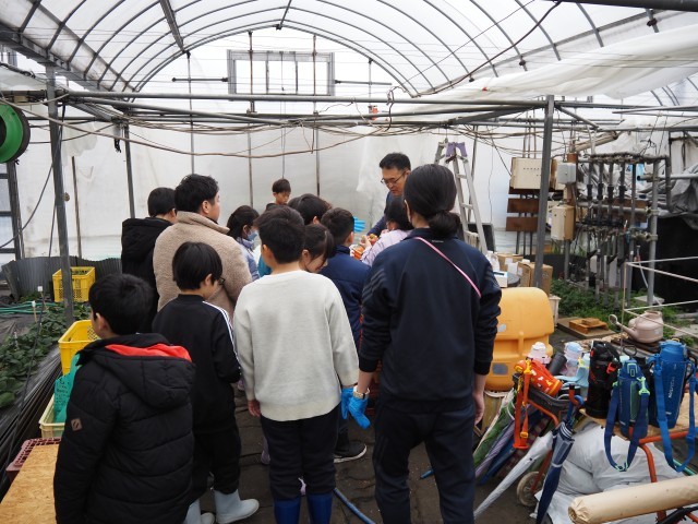 3月3日火曜日、雨天ではありましたがのらくら農園さんのハウス内でいちご栽培学習として収穫を体験させていただきました。上田さんからは「いちごのとりかた」について果実をいためない方法を教えていただきました。その後、収穫を体験させていただいた後、学校に戻りパック詰めの体験をさせていただきました。決められた重さにどう調節するか、いちごを置くむきなど丁寧に教えてくださり、いちごまでいただいて子どもたちにとって充実した学習となりました。上田さん、本日の収穫体験を含め一年を通して学習させていただきありがとうございました。