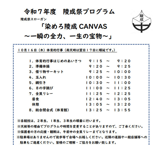 【陵成祭 プログラム】 公開日 2025/10/10 更新日 2025/10/10 お知らせ 陵成祭 体育的行事のプログラムです。ぜひご覧ください! 添付ファイル 令和7年度陵成祭体育的行事プログラム.pdf PDF