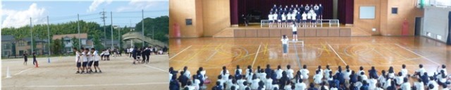 写真は体育的行事の2年生学年練習の様子と、3年生合唱を聴く1年生の様子です。