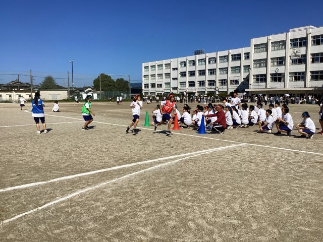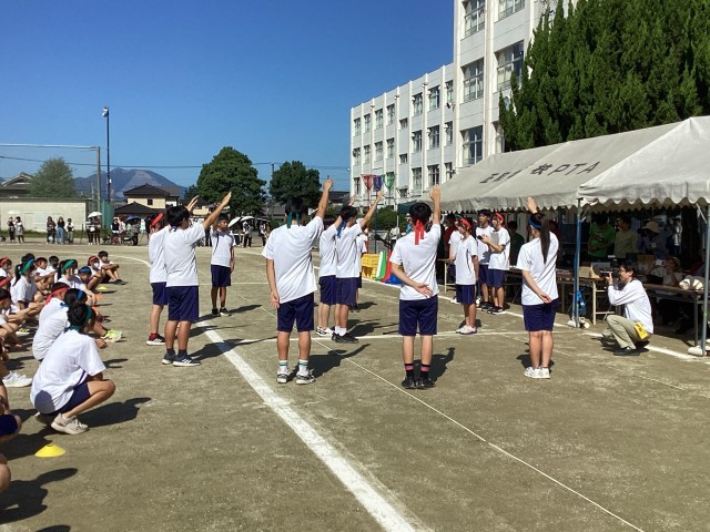 15日から延期になりましたが、当日は暑いくらいの快晴でした。前日の雨の影響も先生方が朝早くから水取りをしてくれたおかげで良いグラウンド状態で開催できました。級長会の立派な選手宣誓で始まりました。学年種目の2年生大縄跳び、1年生台風の目、3年生綱引きは各クラスが力を出し合い見ごたえがありました。どの種目もみんなの一生懸命全力で取り組む姿や、係の仕事を頑張る姿はかっこよかったです。退場するときや係の仕事でグラウンドを駆け足で入り乱れる光景はテキパキとしていて気持ちよかったです。また、自分のクラスだけでなく、他学年も応援する姿に感動しました。特に、全員リレーで大差をつけられても一生懸命走る選手に会場のみんなが拍手を送っていたのは心が温かくなりました。みんなで熱く燃えた一日でした。素晴らしい思い出ができました。