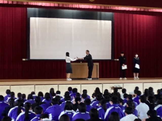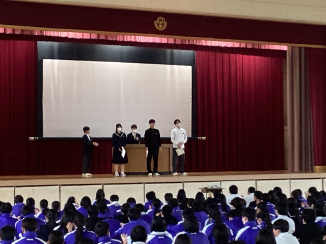 集会では、生徒会副会長の話の後に、生徒会週間の「ポジティブBOX」「正和三大ルールチェック」「図書室お宝さがし」の表彰式や生活実行委員会から「あいさつ標語」の各クラスの代表作品が紹介されました。その後、漢字選手権の表彰が行われ、3年生の漢字選手権5連続金賞受賞者10名に拍手が送られました。
